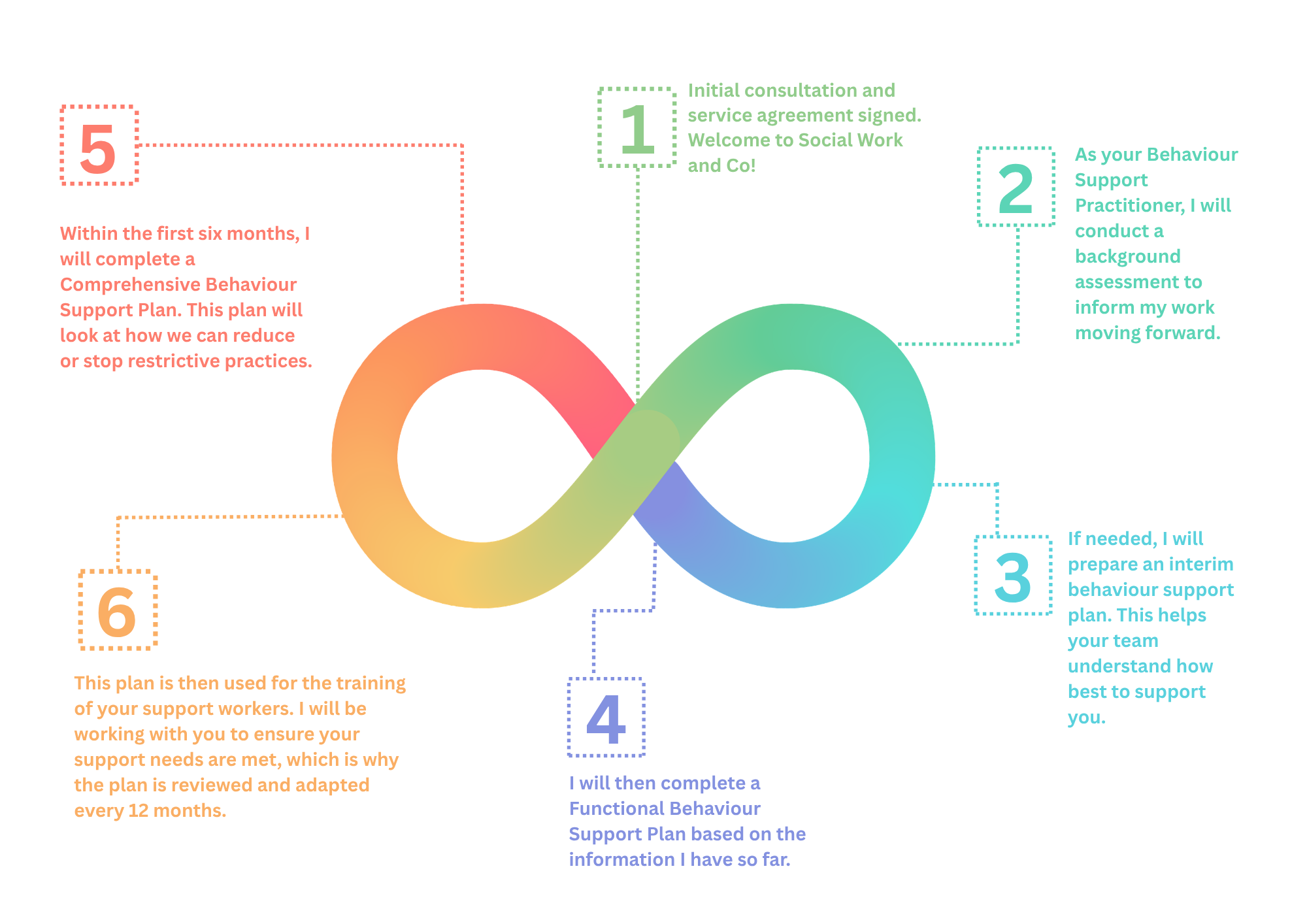 An example of what to expect during the first year of working with a Behaviour Support Practitioner— shown as a figure eight, as the process is continual and evolves over time.